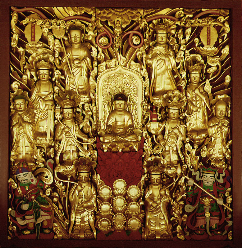 부처의 몸에서 나오는 빛을 형상화한 광배는 아래위의 너비가 같은 조선시대 특유의 형식이다. 불꽃무늬가 위로 솟아서 뻗쳐있고 그 안에 작은 부처들이 표현되어 있다. 본존 좌우에 아미타 8대보살이 있고, 그 밑 좌우에 사천왕 중 증장천과 지국천이 있다. 8대보살은 지장보살을 제외하고 모두 머리에 관(冠)을 쓰고 있으며, 두꺼운 옷을 입고 연꽃을 든 채 활짝 핀 연꽃 위에 서 있다. 본존과 같은 높이에 보살이 서 있고 바깥 좌우에는 나한상이 1구씩 서 있다. 전체적으로 조각수법이 간결하고 양감이 절제되어 평담한 미를 보여준다.